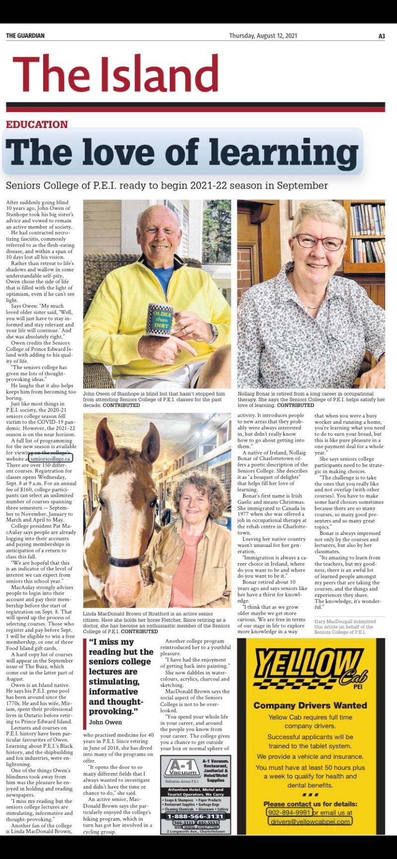 Owen credits the Seniors College of Prince Edward Island with adding to his quality of life.